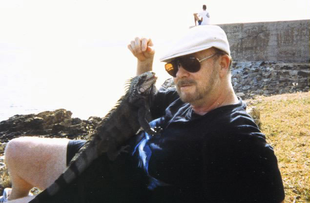 "Here's me feeding a wild iguana hibiscus flowers in St. Thomas."Perhaps this lizard was the inspiration for his book, "Raptor" in which a boy finds an egg in a cave which hatches into a baby raptor dinosaur. Little does he know there is a ferocious mother raptor who will stop at nothing to get her baby back.Previous | Home | Next |