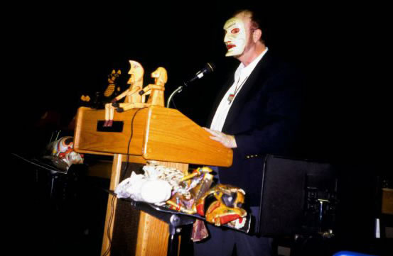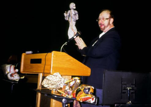 Paul presenting in a school autitorium. Here he describes the different mythical puppet figures and masks from Bali.