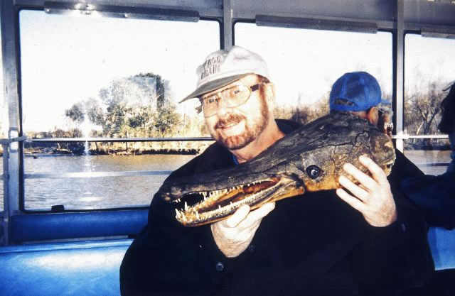 Paul in New Orleans researching a movie project for Nickelodean."Here I am with the head of an alligator gar fish while researching alligators in the Louisiana swamps. Kids actually go rubber-tubing there and don't seem to care if they nipped or not."Previous | Home | Next |